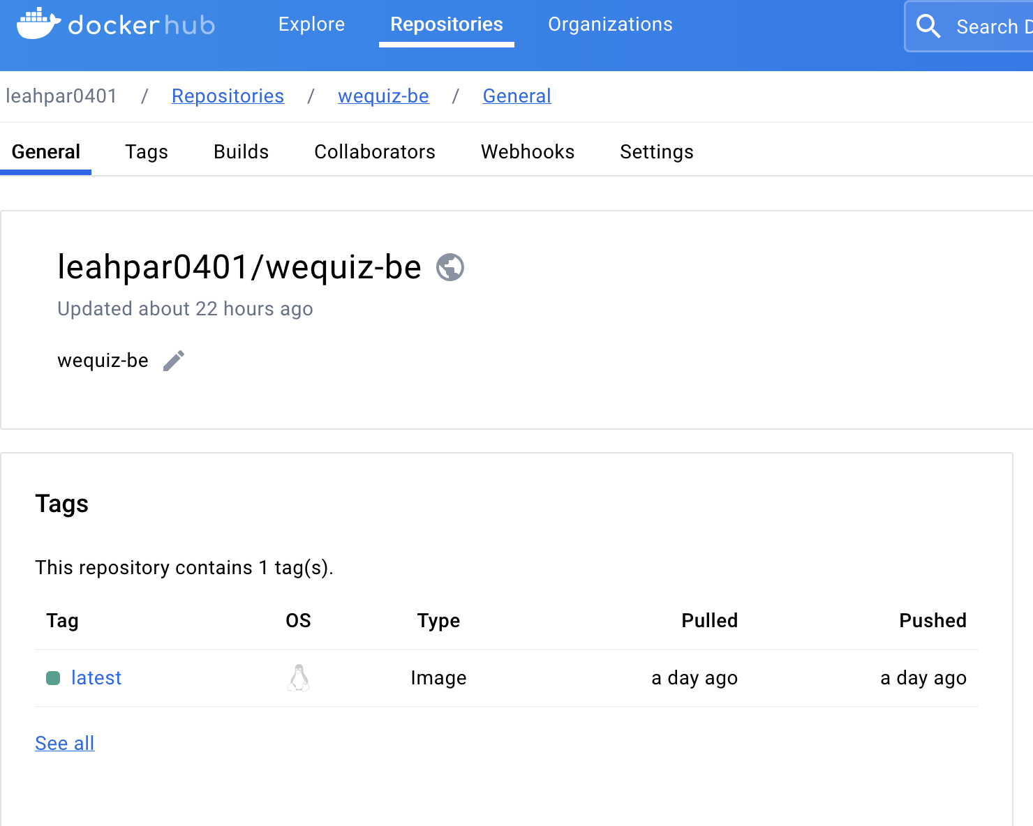 - 당연하게도, Docker hub에 미리 계정을 만들어 두어야 한다. 우리가 만든 이미지가 Docker hub의 본인 레포지토리에 저장되기 때문이다. 아래 tags에 레포지터리명을 넣어두었는데 레포지토리 또한 미리 만들어두어야 한다.