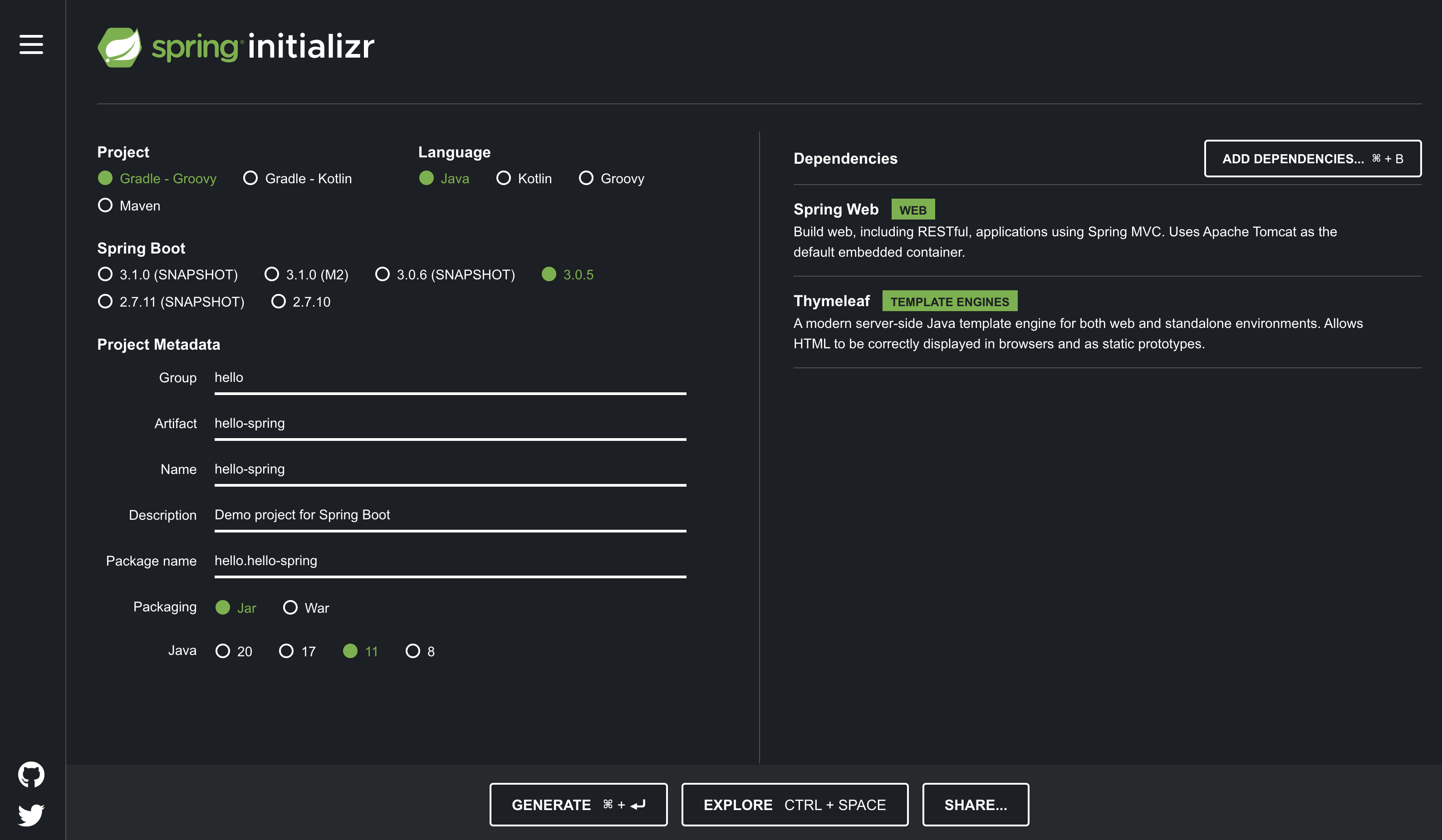 Spring Web, Thymeleaf 라는 dependency들을 추가해 주었다. Spring Web은 Spring을 기반으로 Web Application을 빌드하기 위한 것들을 제공하며, Thymeleaf는 template engine 중 하나인데 html과 spring 사이에 데이터를 주고받을 수 있도록 해주는 template이다. Django Template 문법과 유사한 것 같다.