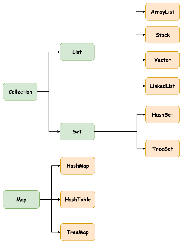 위의 그림에서 초록색 박스는 Interface, 주황색 박스는 Class이다. 물론 그림에 있는 게 다는 아니지만 많이 사용하는 것 위주로 적어보았다. 이 글에서는 대략적인 특징만 설명하고 구체적인 내용은 각각의 포스트를 만들어 작성할 예정이다.